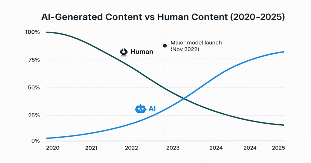 Peste jumătate din articolele noi publicate online sunt generate de AI, arată o analiză realizată pe un eșantion de 65.000 de URL-uri din arhiva Common Crawl (2020–2025). Potrivit studiului, pragul de 50% a fost depășit în noiembrie 2024, după care ponderea a rămas relativ stabilă în 2025.